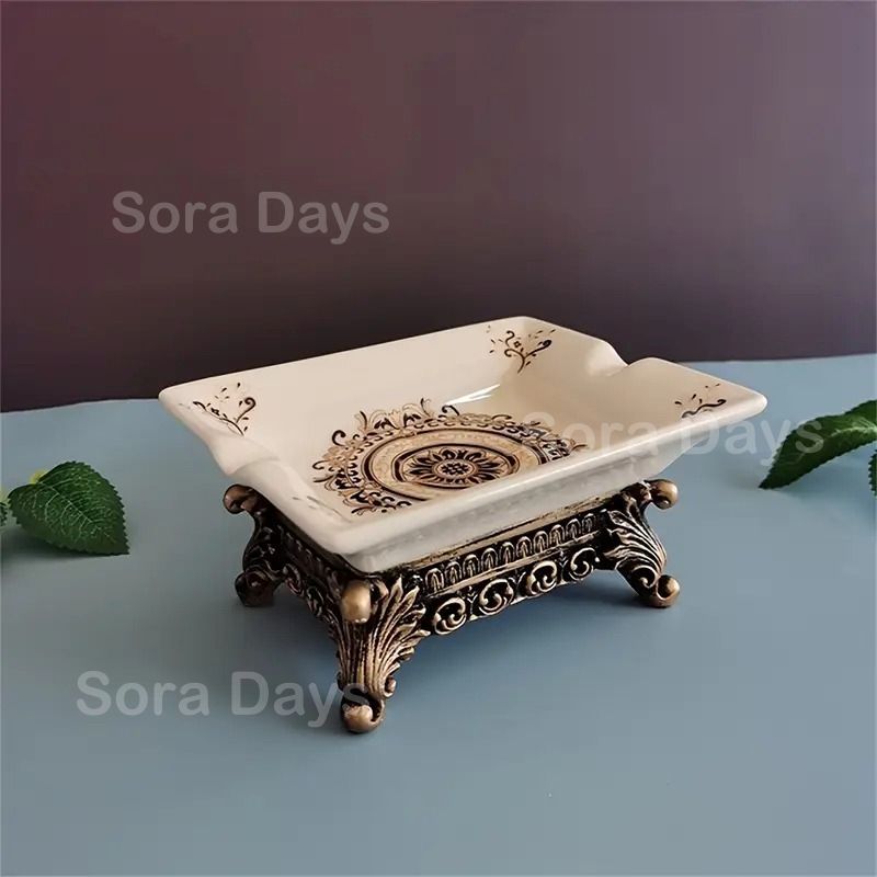 ソープディッシュ ソープホルダー 石鹸置き 花柄 ヴィンテージ調 おしゃれ エレガント インテリア 北欧 西洋風 水切り 排水 スクエア 四角 長方形 ゴールド台座 セラミック 14 11 7 cm