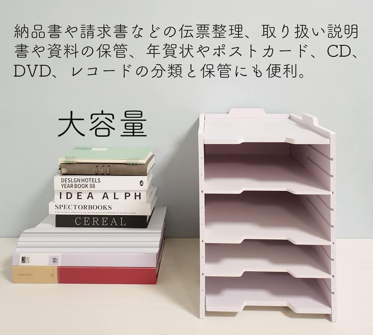 【使いやすい】納品書や請求書などの伝票整理、取り扱い説明書や資料の保管、年賀状やポストカード、CD、DVD、レコードの分類と保管にも便利。普段はファイル収納ボックスを前向きして、来客時は反対向きにしまって中身を隠すことも可能。