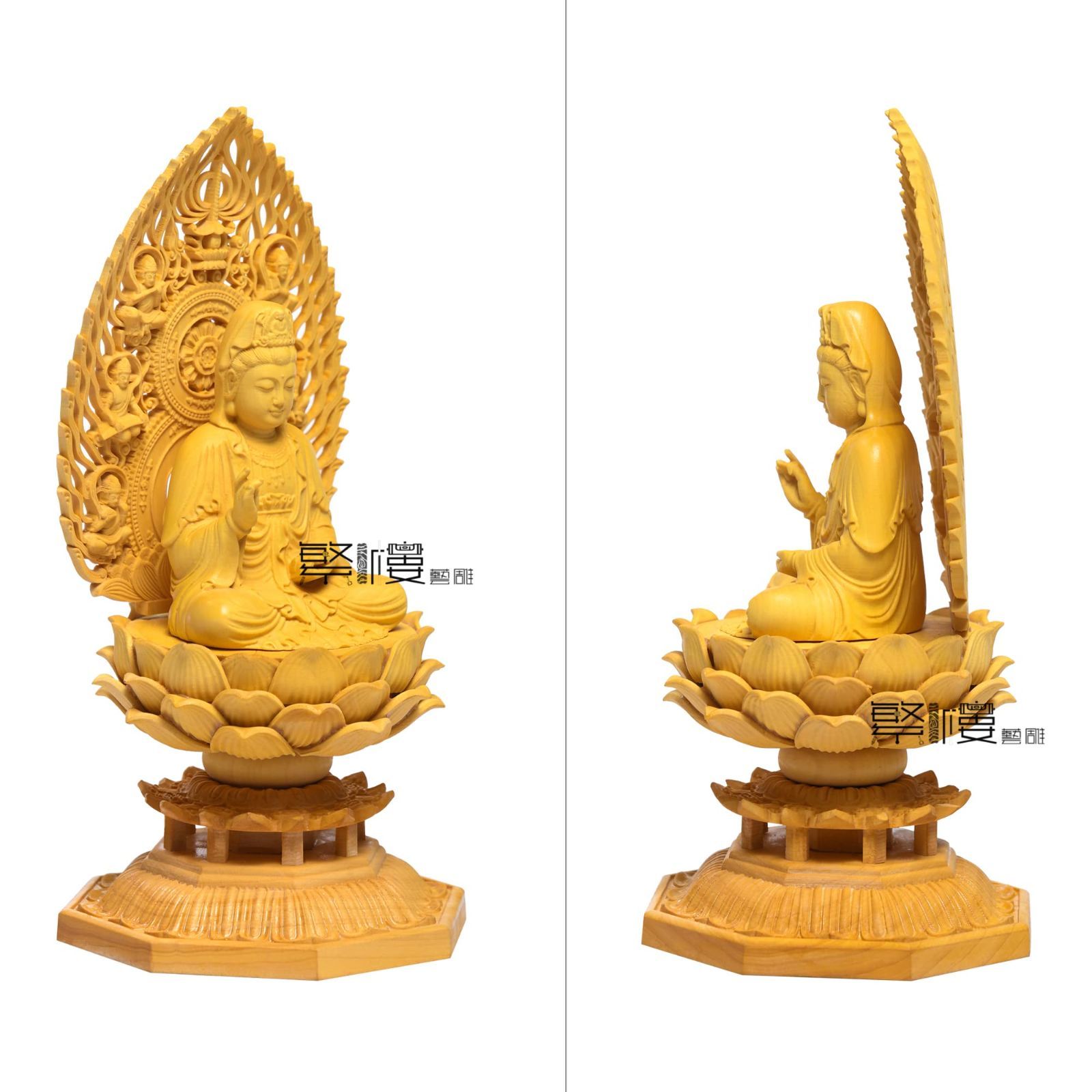 観音像 観音菩薩 仏壇仏像 仏像 木彫り 置物 繁樓藝雕 飛天光背 八角台座 柘植の木 TheChanger 祈る 厄除け 高さ17 cm 巾8 5 奥行8