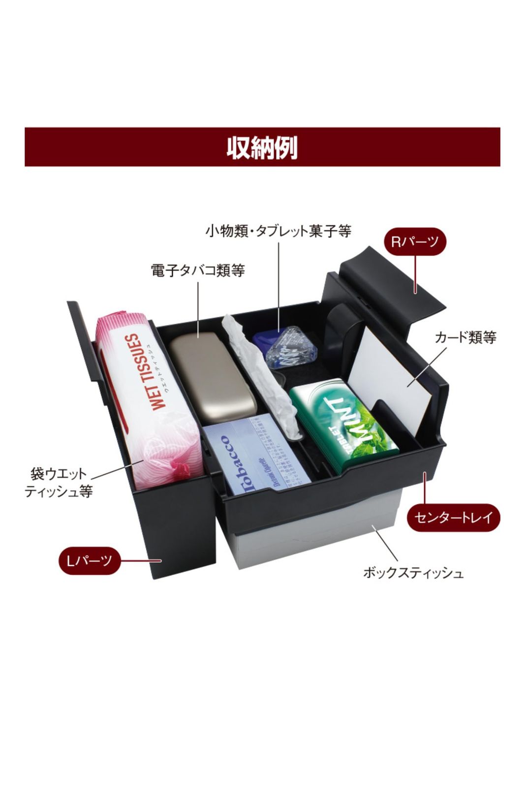SY-AV8 40系 アルヴェル専用 サイドBOXゴミ箱プラス 運転席用 商品説明 40系アルファード・ヴェルファイア(AAHH4#/AGH4#/TAHA4#)右ハンドル車の運転席側フロントドアポケット専用のゴミ箱&折りたたみ式ハンディーモップ(専用ケース付き)です 専用設計で、運転席側フロントドアポケットにピッタリフィットします 運転席側フロントドアポケットに入れるだけの簡単取り付けです フタを押すと開き、フタを閉じて押すとロックする構造で、簡単に開閉することができます フタにはダンパーを採用し、スムーズな動きで開きます たまったゴミは本製品のゴミ箱を上下分割して捨てることができます ホコリをしっかりキャッチする極細繊維のハンディーモップを付属しています 内装に合わせた革シボ調です ゴミ箱の容量は約1.3Lです 調査日(2023年5月現在)以降のマイナーチェンジ車には適合しない場合があります 運転席側フロントドアポケットに追加オプションが装着されている車両へは取り付けできません SY-AV10 40系 アルヴェル専用 コンソールボックスインナートレイ 商品説明 40系アルファード・ヴェルファイア(AAHH4#/AGH4#/TAHA4#)右ハンドル車のコンソールボックス専用のトレイです 専用設計で、コンソールボックスにピッタリフィットします 両面テープで貼り付けてセットするだけの簡単装着です スマートフォンや財布等の小物を手軽に置けます 収納物が傷付かないクッション付きです センタートレイ裏側にボックスティッシュをベルトでセットできますボックスティッシュの取り替えはベルトを調節するだけで簡単に行なえます 内装に合わせたシボ調です 調査日(2023年5月現在)以降のマイナーチェンジ車には適合しない場合があります コンソールボックスに追加オプションが装着されている車両へは取り付けできません 収納物によっては、コンソールボックス内の電源等が使用できなくなる場合があります 本製品は下記の条件を満たすボックスティッシュに対応します 袋入りタイプのティッシュには対応しません