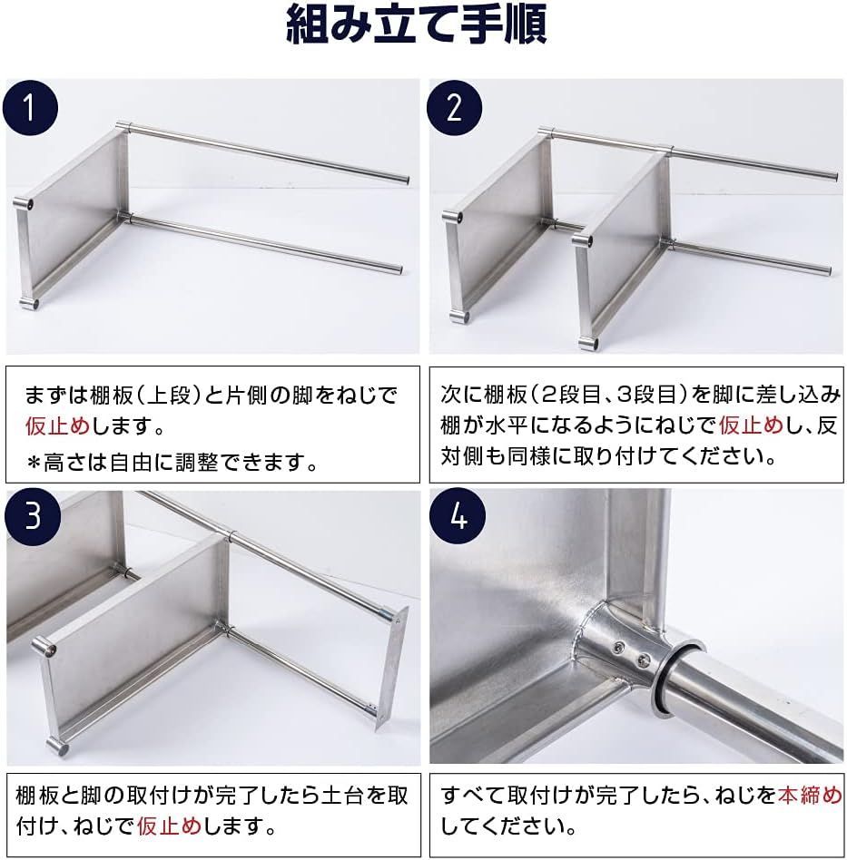 【ガッチリ構造】驚きの板厚約1.2mmのステンレス採用、しっかりとした厚みだからこそ!安心の強度を実現しました。30mmの棚板を採用、たわみを軽減します。
