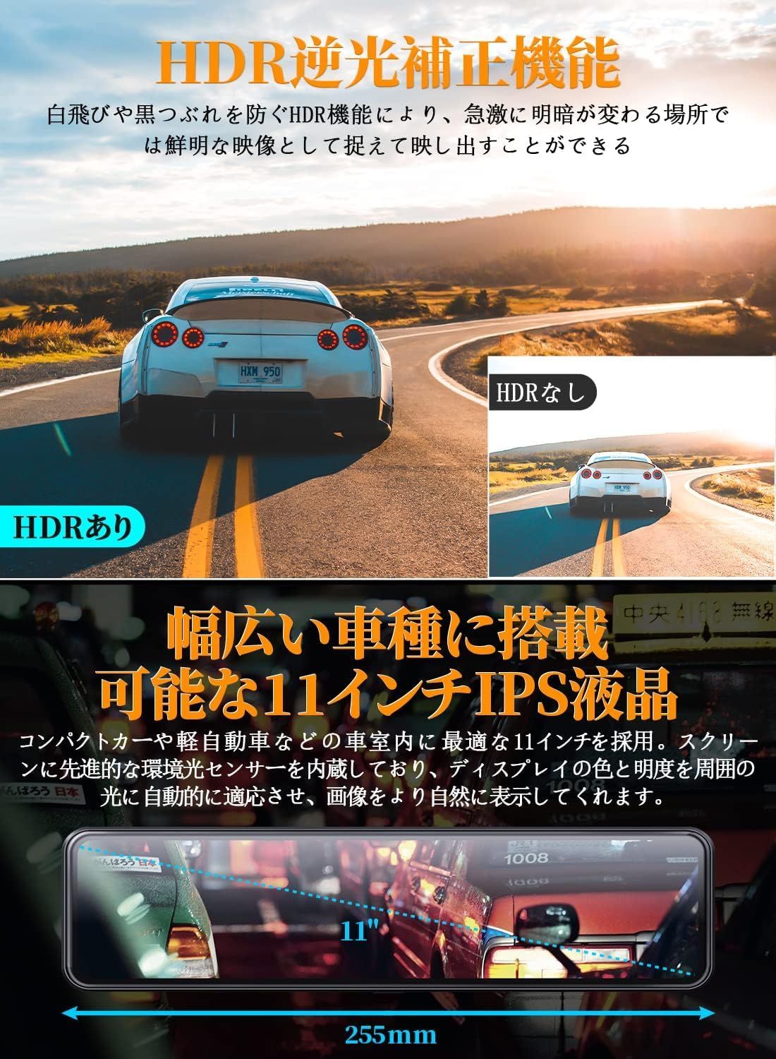 【サイズ感が良い11インチIPS液晶+自動調光機能+HDR機能+便利なタッチパネル式操作】 ?幅広い車種に取り付け可能な11インチIPS液晶を採用しております。?スクリ―ンに先進的な環境光センサーを内蔵しており、ディスプレイの色と明度を周囲の光に自動的に適応させ、画像をより自然に表示してくれます。急激に明暗が変わる場所でわざわざ手動で調整することが必要ないため、運転に集中できることでより安全な運転を確保しております。?白飛びや黒つぶれを防ぐHDR機能を搭載しており、光の明暗差を補正し、夜間の撮影が半端なく綺麗で映ります。?便利なタッチパネル式操作で、レンズ上下調節や画面輝度調整が可能です。
