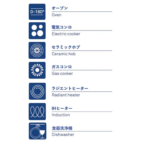 ■「使用可能な熱源」はガス直火、IH、オーブン、電気プレート、シーズヒーター、ハロゲンヒーター。
