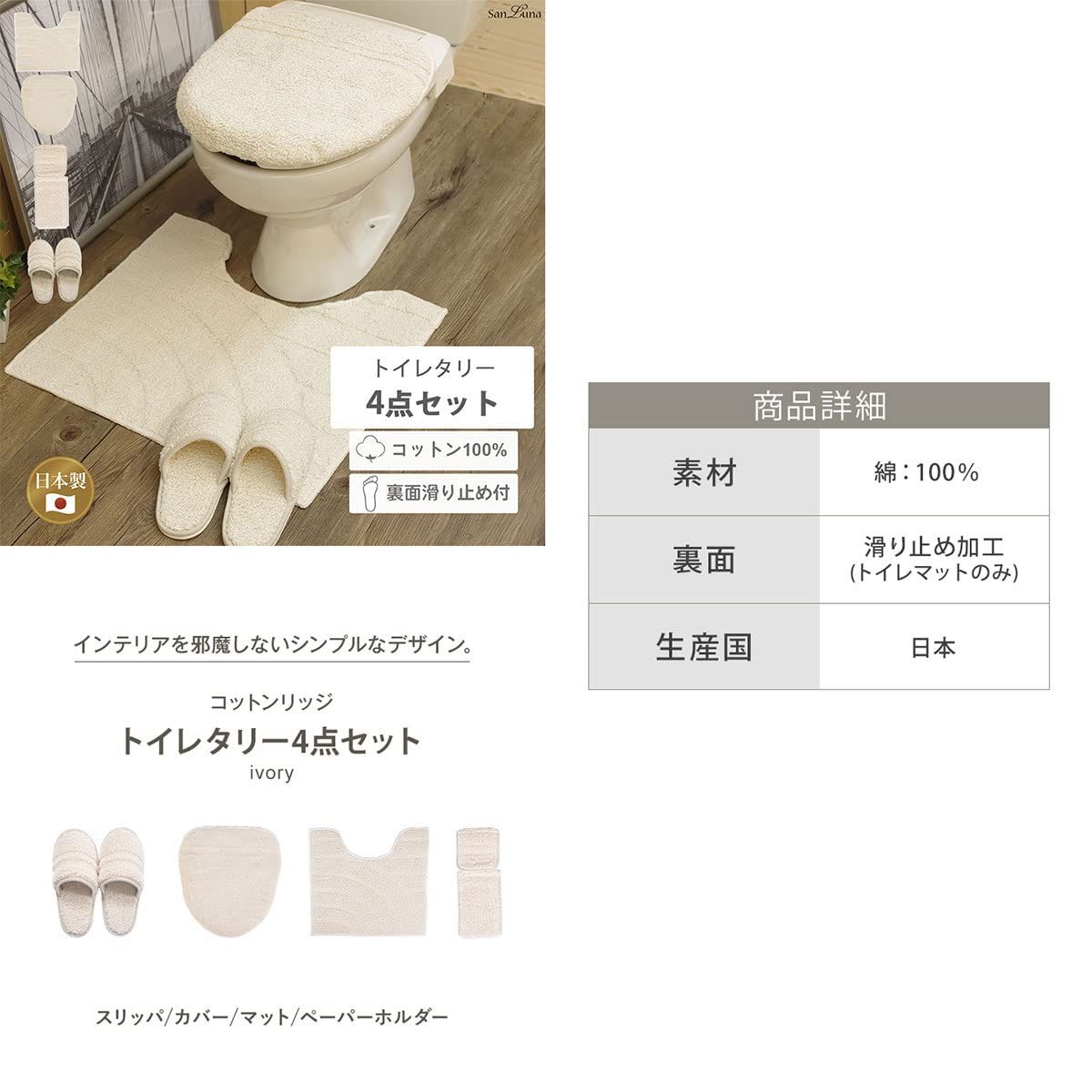 San-Luna トイレタリー 4点セット 【コットンリッジ】 アイボリー 日本製 綿100% 滑り止め | トイレマット 55cm × 60cm / トイレふたカバー / スリッパ / トイレットペーパーホルダー / 洗える おしゃれ かわいい 綿 コットン 足元 足下 マット 55×60