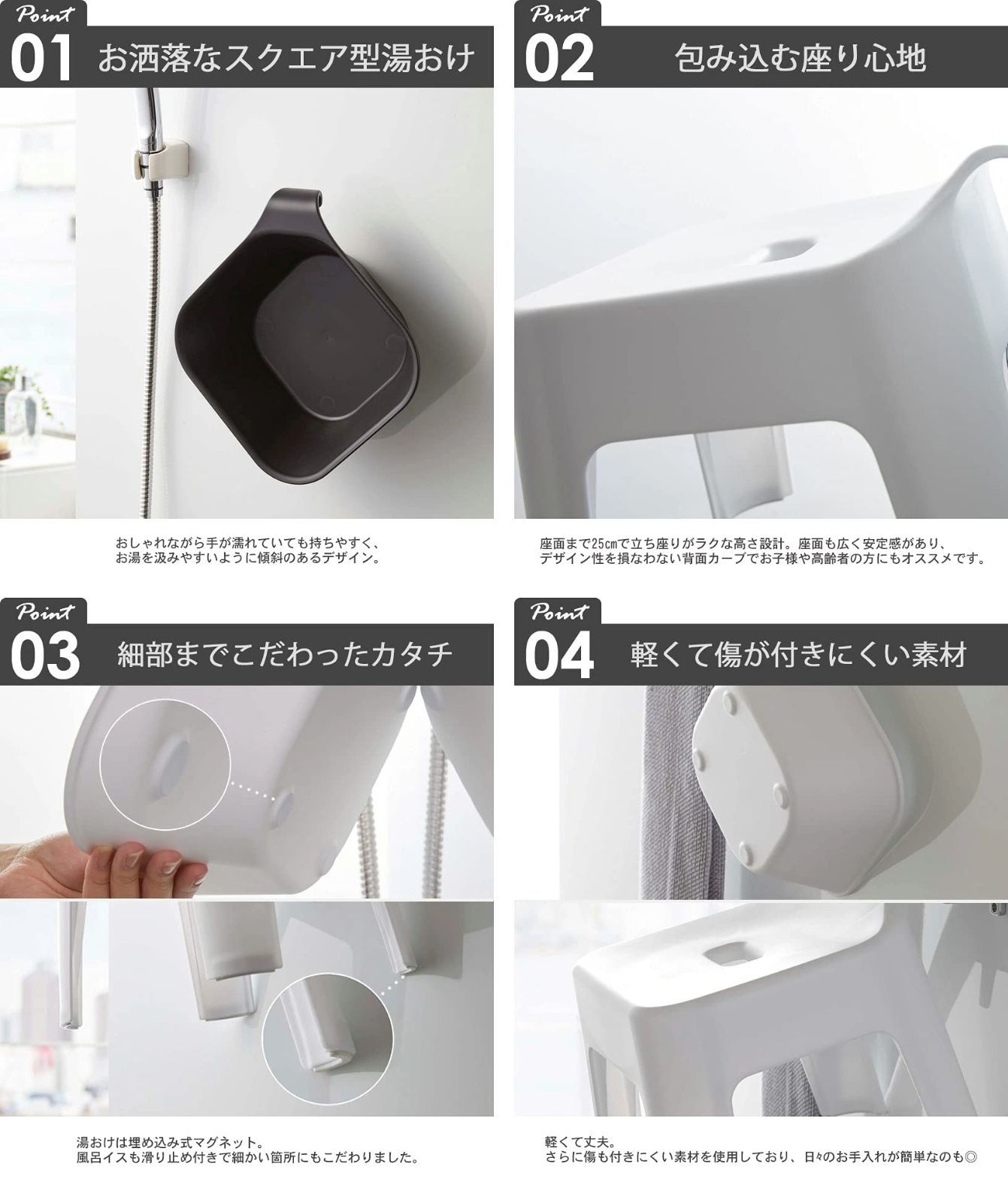 水分を素早く乾燥!浴室の壁面にマグネットでくっつく湯おけとタオルバーやシャワーフックにも浮かせて収納もできる風呂イス(座面高25cm)のセットです。 丁度よいサイズ感と濡れた手でも持ちやすいデザインの湯おけ。使い終わったらそのままマグネットで壁に浮かせて収納が可能です。フック付きなのでタオルバーやシャワーフック、浴室の扉のハンドルに引っ掛けておけるのも◎ 通気性抜群の風呂イスも座りやすいデザイン。大きめの座面穴で水切れも良く乾燥もバッチリです!イスの後ろに突起が付いているのでシャワーフック(2.5cm以上)に浮かせて収納できるのも嬉しいポイント♪ オシャレで実用性も兼ね備えた『湯おけ』と『風呂イス』のセットで、すっきりスタイリッシュにまとまり快適なバスタイムが過ごせますよ♪ 新築祝いなどの贈り物にもオススメです。
