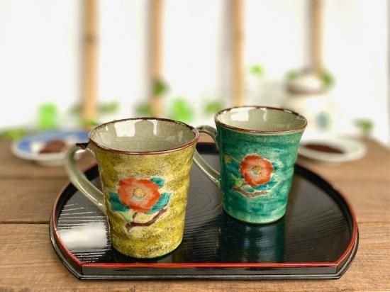 メーカー直送 九谷焼 ペアマグカップ 椿に鳥 黄塗り 緑塗り 裏絵