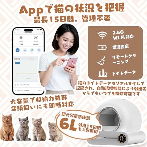 猫 自動トイレ 猫トイレ静音 自動猫トイレ 65 L超ワイド空間 最大12 kg対応 9 L大容量 15日間ゴミ捨て不要 Wi Fi接続 タイマー設定 4重安全センサー 健康管理 体重 排泄記録 15 cm低入口設計 子猫も安心 丸洗い可 多 dd 5 b 19 e 2