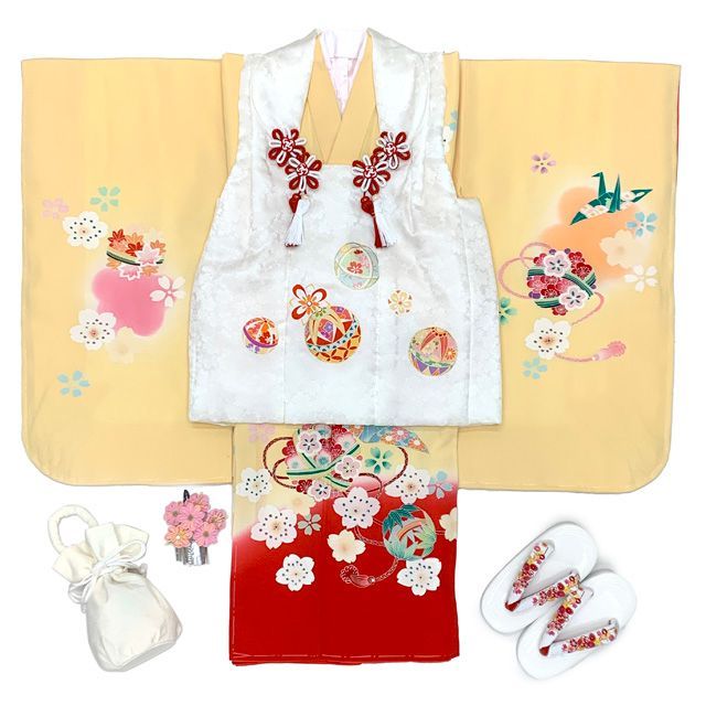 七五三 着物 3歳 正絹 フルセット 女の子 友禅 絵羽柄の着物 被布セット 白x黄赤 鞠 花手鞠 w aWset