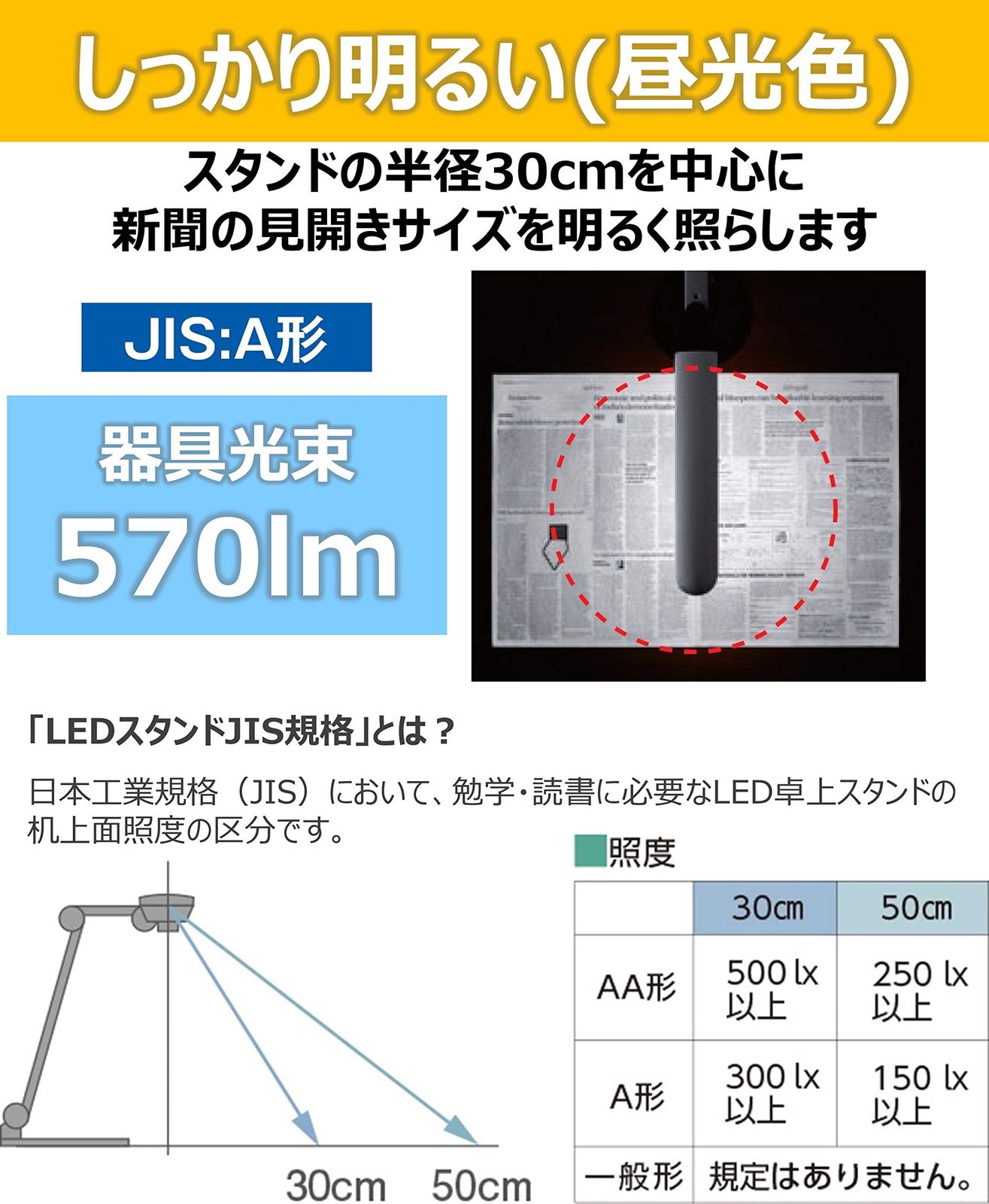 JIS:A形相当の明るさで、新聞見開きサイズを明るく照らす