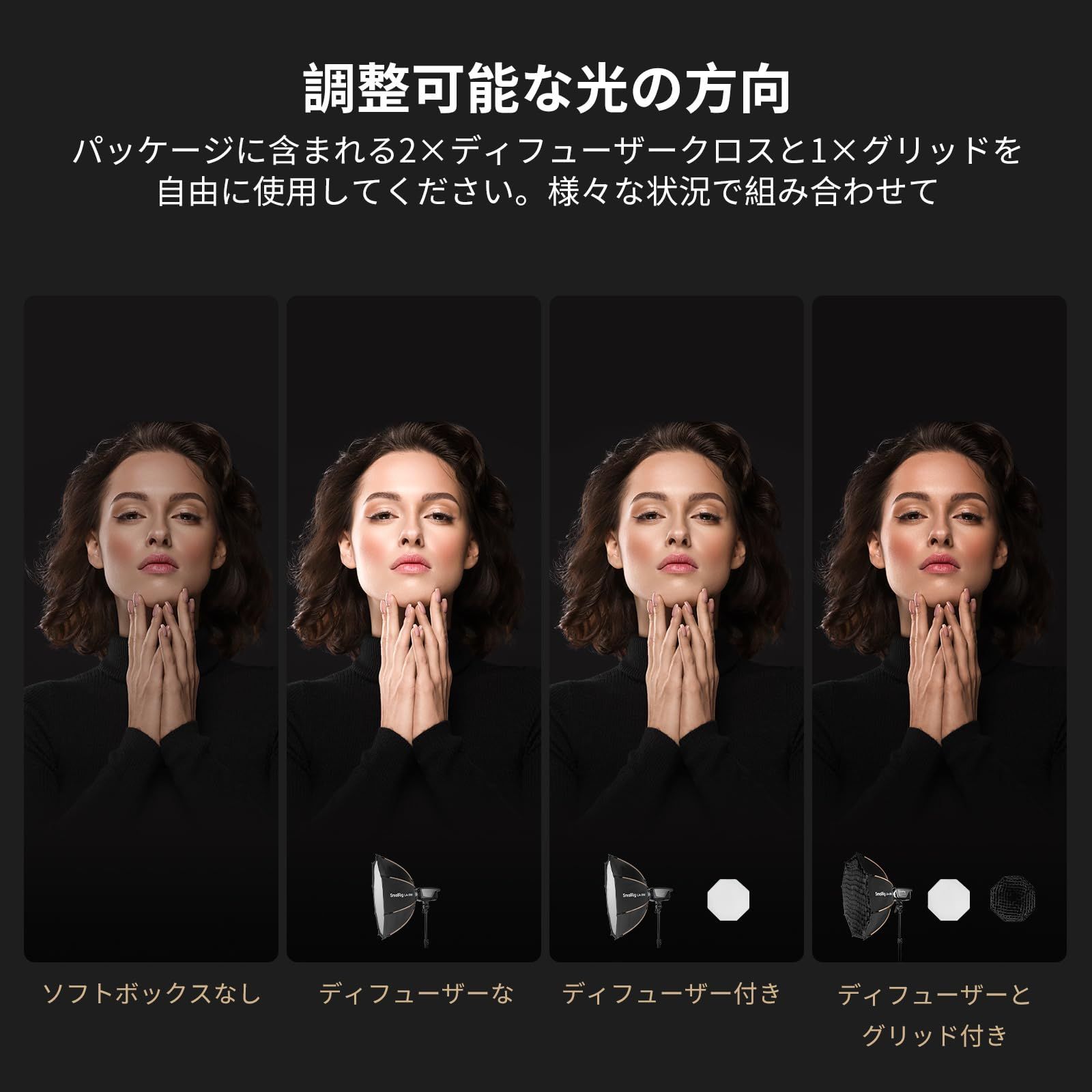 【折りたたみ式で持ち運び可能 】この SmallRig ソフト ボックスは簡単に折りたたんで収納でき、重さはわずか 900g です。 収納バッグが付属するこのライトボックスは、コンパクトなおかげで旅行用のキャリーケースや狭い収納スペースにも収まる。