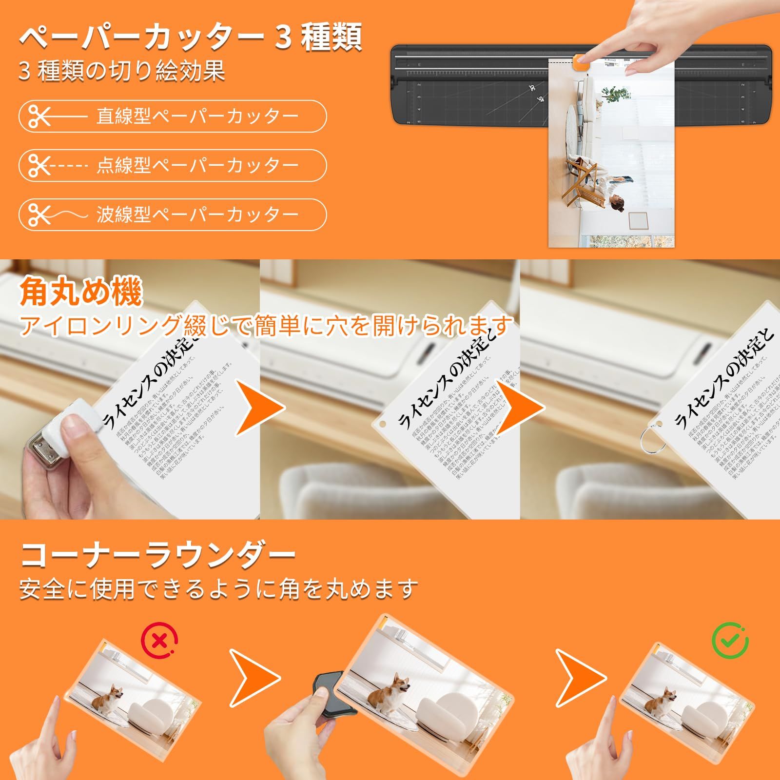 【6-in-1設計 ワンタッチリリース機能】ラミネーターは省スペースで使いやすい収納式デザインを採用しています。ラミネーター本体 ×1、カッター ×1、パンチ ×1、角丸カッター ×1、手帳リング ×3、A3-A6サイズのラミネートフィルム ×5 80mic、ご自宅でも、手軽にお好みのサイズにDIY加工ができ、指を傷つける心配もなく、部品の紛失も防げ、空間を有効活用できます。※ご使用の際は、パンチ、カッター、ノートリング、角丸カッターなど全ての付属品を収納部から取り出してから操作してください。