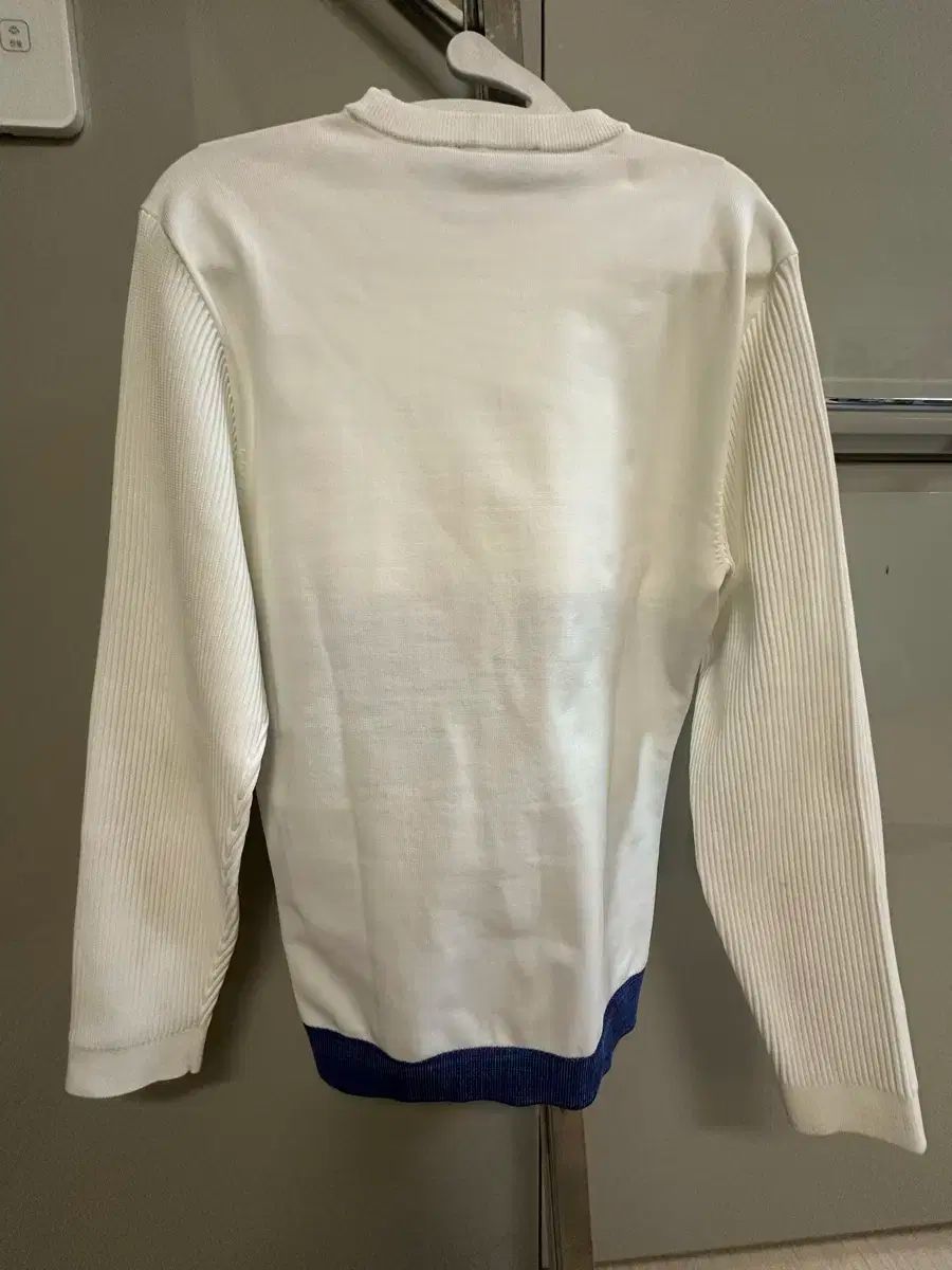 すっきりとしたホワイト/ネイビーのストライプの組み合わせがクラシックなゴルフニットです。サイズ100では、95を着ている人でもゆったりフィットすると思います。