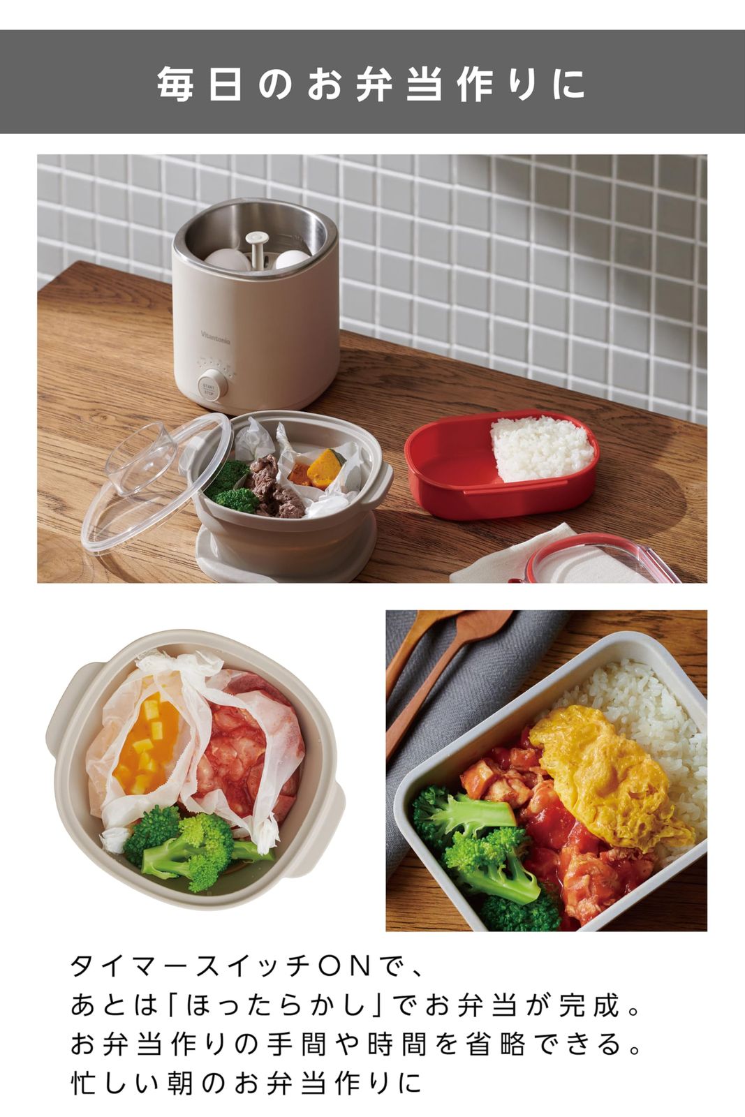 ?【料理の幅をぐっと増やすスチーマー】料理を同時に作る時に、何度も調理器具を洗う必要はありません。エッグトレイで卵をゆでつつ、スチーマーで野菜や肉の調理をすれば、洗う回数をグッと減らせます。蒸した料理はそのまま、スチーマーの下にお皿を敷けば食卓に出せます。プラスチックスチーマー、シリコーンスチーマー、エッグトレイは食洗機対応だから、片付け・お手入れも簡単。