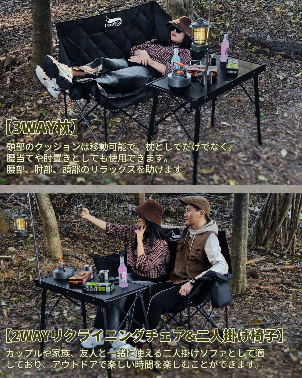 DesertFox キャンプ 椅子 2人掛け アウトドアチェア 二人用 折りたたみ コンパクト ソファチェア カップルチェア【独自開発のカップホルダー&クーラーボックス】 【耐荷重300kg】 枕付き 軽量 イス 椅子 収納袋付き お釣り 登山 運動会 ガーデン 室内 携帯便利 SRY