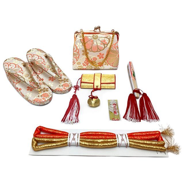 正絹 七歳女の子四つ身の着物に、結び帯やハコセコセットをコーディネートしたフルセットです。