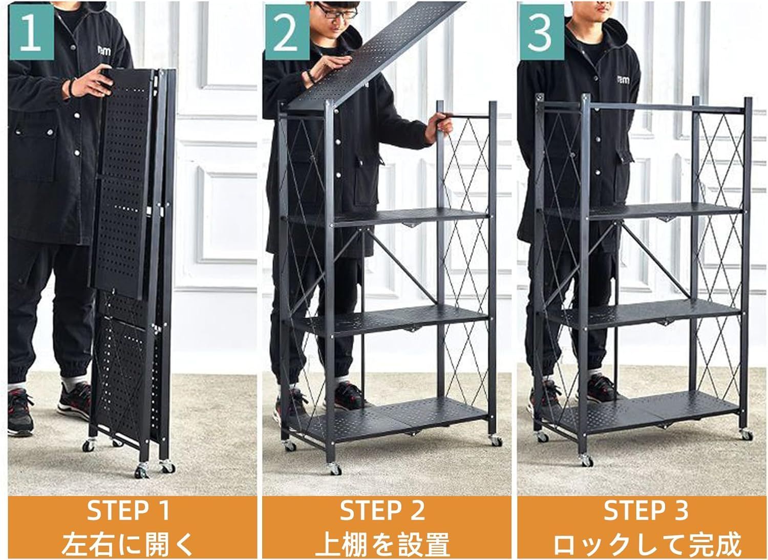 「組み立て簡単」 面倒な組み立て不要、開くだけで使用可能、女性でも簡単に組立てられます。キャスターを取り付けて、ラックの左右に広げてロックをかかれば組立完了です。