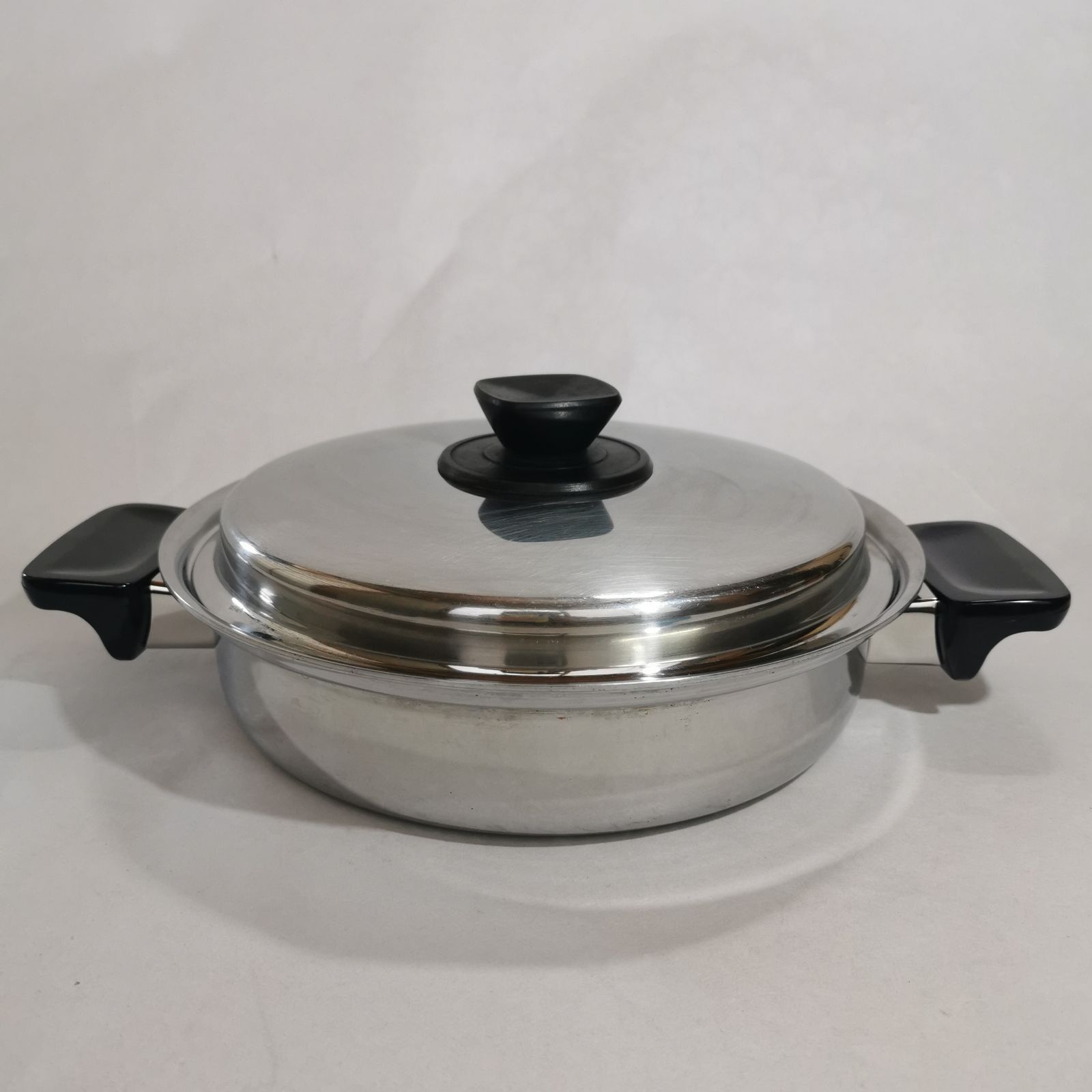 ビタクラフトのスーパーファイブ、5層お造りの浅型の両手鍋です。炒め物、蒸し物、鍋など、さまざまな料理に使えます。