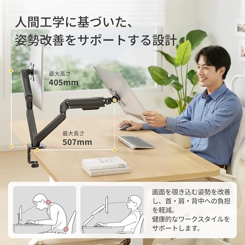 【人間工学に基づいた、究極の姿勢改善ツール】固定式のスタンドとは異なり、monTEKモニターアームなら画面の高さを視線位置に合わせることができ、画面を覗き込む猫背姿勢を根本的に解消し、首・肩・背中への負担を大幅に軽減し、健康的なワークスタイルへとサポート。まるでオーダーメイドのように最も快適な環境で使用し、長時間でも疲れにくい人間工学に基づいた快適なワークスペースを実現します。