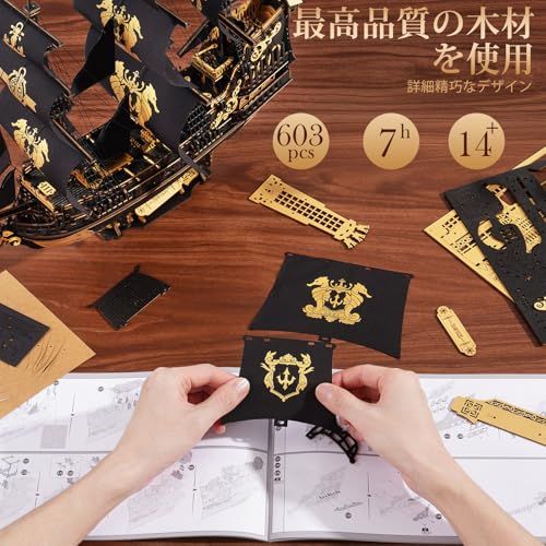 デザイン:甲板には3本のマストがそびえ立ち、マストに沿って8本の横帆と5本の縦帆が効率的かつ華麗な帆列を形成している。 ウッドパズルの船体は、インクブラックのホブネイルカラーで塗装され、パネルの一部はきらびやかなゴールドのシルクスクリーンで装飾され、整然と並んだ10門の金色の大砲が威厳と威厳を漂わせている。