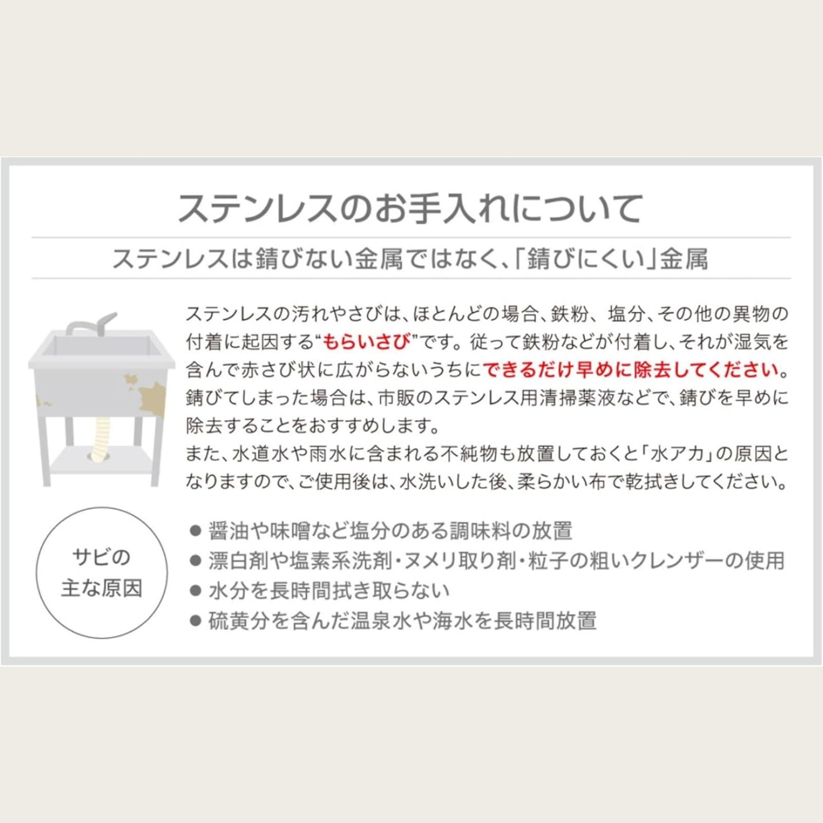 ※シンクでの作業終了時には水分や汚れをよく拭き取ってください。清潔な状態を保つことにより、さらにサビの発生を予防することができます。