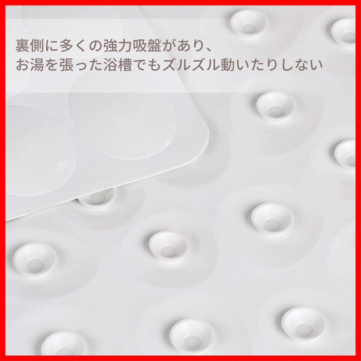 【安全安心】本製品は吸盤で安定性抜群!表面が滑り防止のためのコブルストーンような凸凹のあるデザインで、乗っても滑りにくくなっています。裏面が全面に吸盤で床としっかり吸着固定、ズルズル動いたりしません。耐熱温度が70℃まで、お湯を張った浴槽でも安心して使えます。