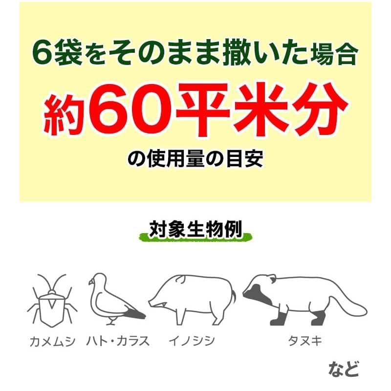 ?使用方法/1.害虫・害獣が発生して被害が出ている場所へ直接撒く。 2.水切りネット等に適量を入れ柱などに吊るす。 効果は3ヶ月程度持続しますが、使い方によっては1年以上あります。