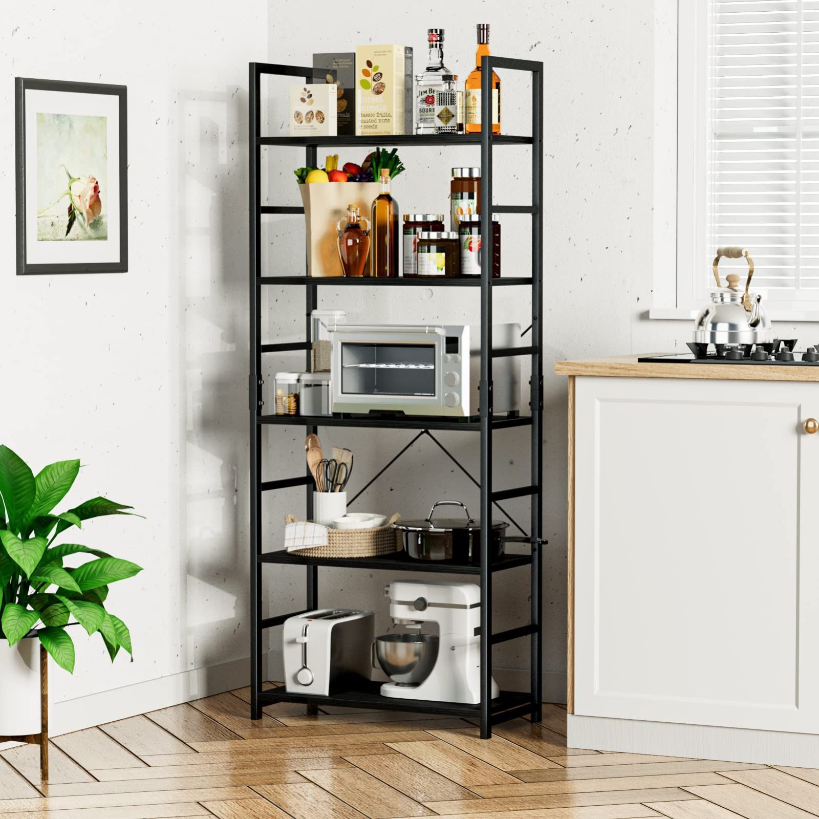 【5段多機能収納ラック】この5段式のアイアンラックは広々と使えます。さまざまなアイテムを置くのに有効に活用できます。書籍、アルバム、工芸品、鉢植えを飾ったり、置いたり使用してもOKです。きれいな化粧板を採用しており、傷や水分に強い、簡単に汚れを拭くことができます。棚板サイズ:幅60×深さ30センチ。