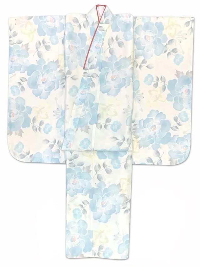 七五三 7歳 女の子用 小紋柄 四つ身の着物と結び帯 他 フルセット 白系 薄青芍薬 T 7 K 2547 f