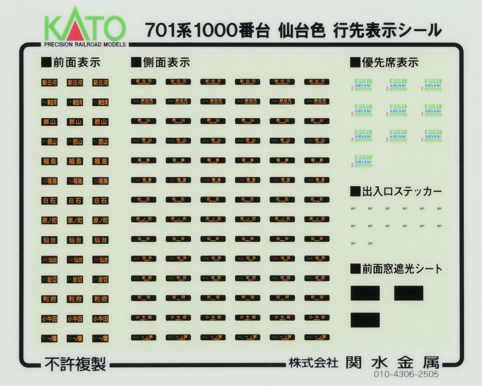 前面表示は「仙台」取付済。交換用の前面表示 (無地)と行先表示シールを付属。