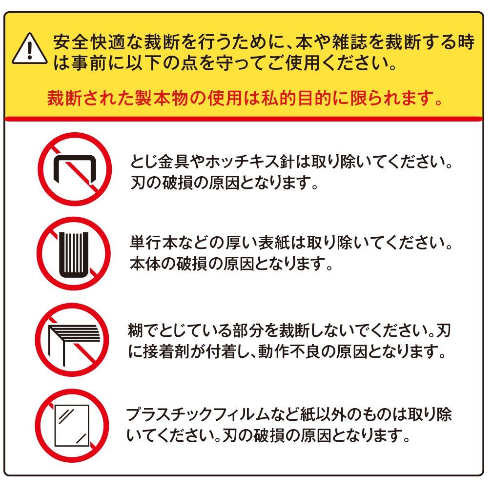 ・製本用のホッチキス針や堅い樹脂などを断裁されると刃こぼれや機構部品の損傷を起しますのでご注意ください