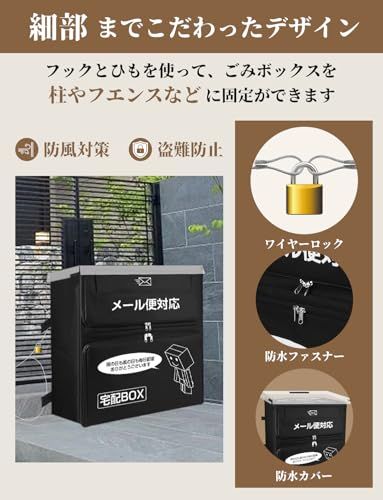 ?防水カバー付属?この宅配ボックスには防水カバーをマジックテープで上部に設置可能、二重防水素材を採用し雨を恐れない、頑丈ながら防水性が更に極めます。防水素材を採用するため汚れでも清潔しやすい。また、南京錠付きで盗難防止! 雨・風・紫外線に強い素材で、屋外でも長く使えます。フックとひもを使って、ごみボックスを柱やフエンスなどに固定ができます。