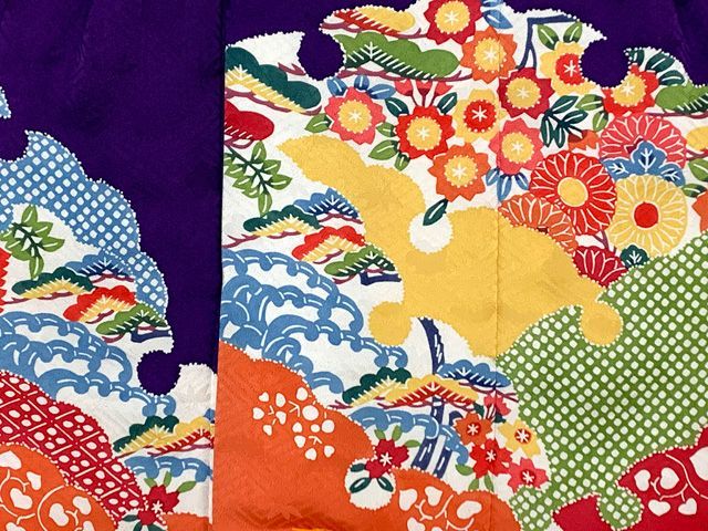 七五三 着物 3歳 正絹 フルセット 女の子 和染紅型 被布コートと本絞り総刺繍柄の着物 被布セット 紫x山吹 京紅型 h 03 set