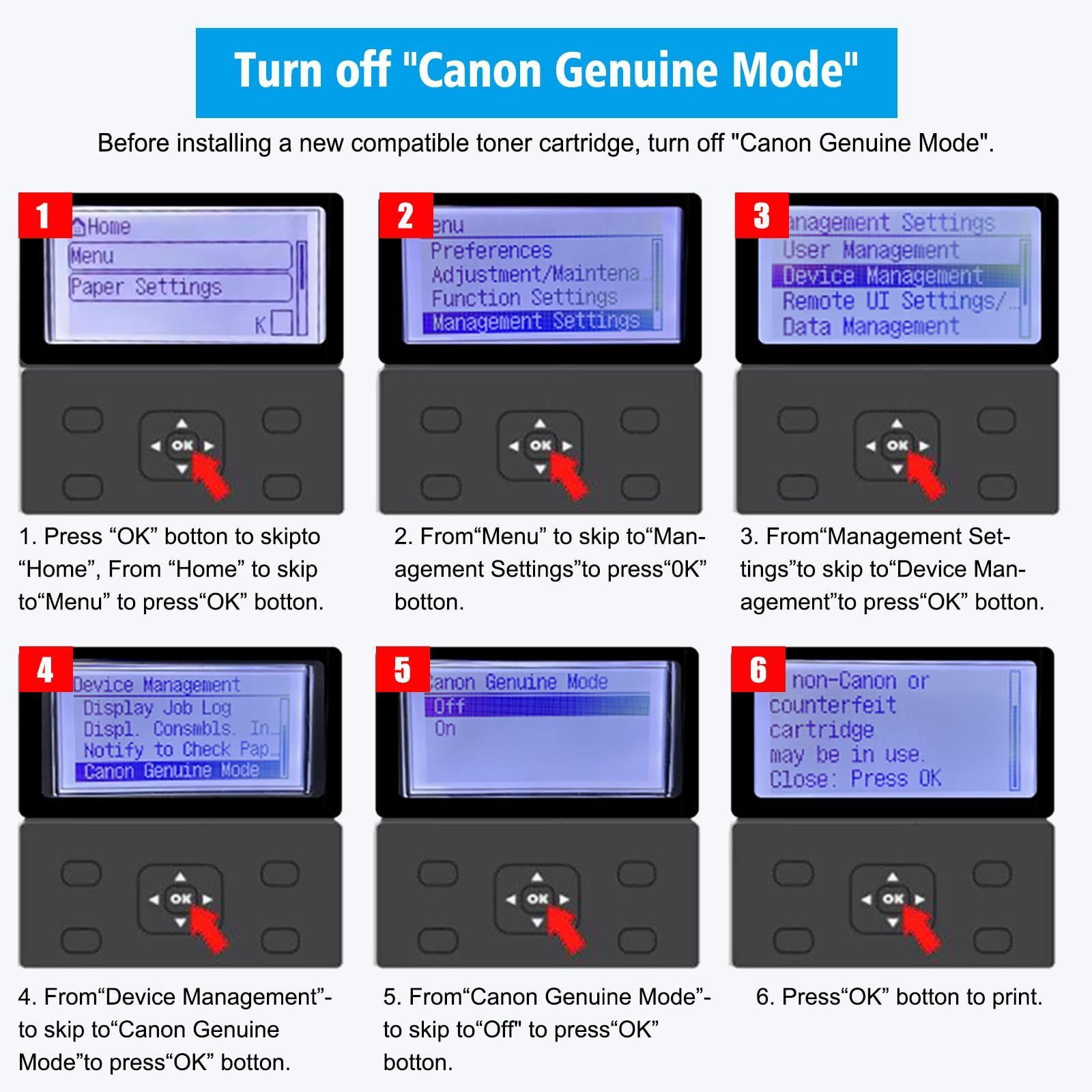 1.注意: プリンターに「Canon 純正モード」がある場合は、このモードを閉じる必要があります。次手順に従て、Canon 純正モードを閉じてください: [管理設定] > [デバイス管理] > [Canon 純正モード] > [オフ]。Canon 純正モードを閉じた後、 互換性のあるトナーをインストールすると、プリンターに「Canon 以外のカートリッジが挿入されている可能性があります」というメッセージが表示されます。単機能プリンターの場合は「OK」キーを押す、多機能プリンターの場合は画面で「閉じる」をクリックするだけで、トナーが機能するはずです。