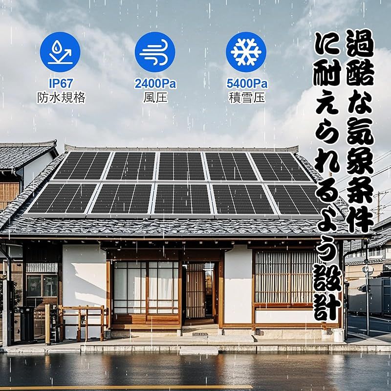 【耐久性】パネルは5+腐食しにくいアルミフレーム構成!表面は3.2mmの低鉄ガラスで構成されて強風(2400Pa)および雪荷重(5400Pa)に耐えます。外の高温時や積雪の日などでもしっかりと発電できます。