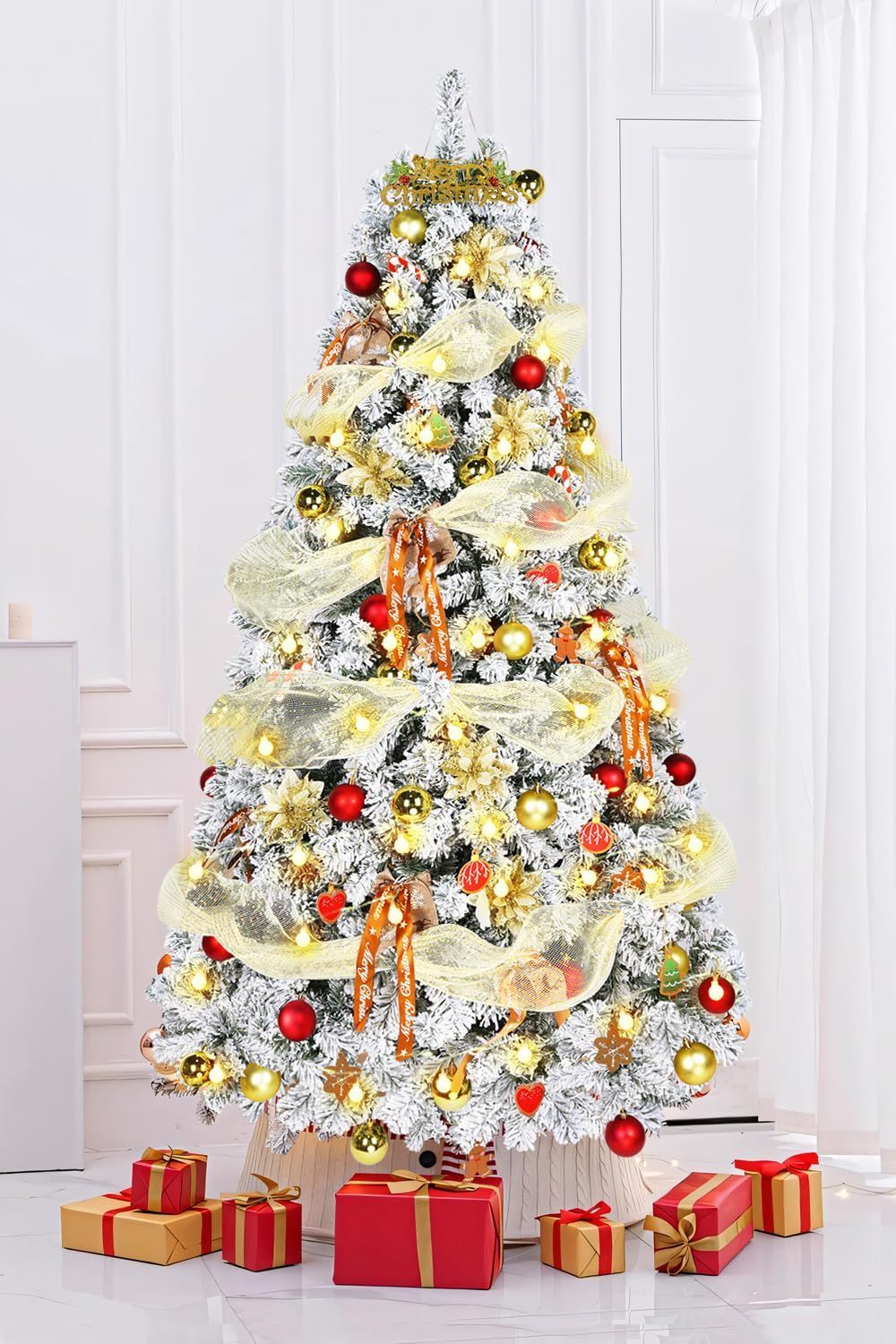【豊富なオーナメントセット】14種類の豪華なオーナメントセットです!6cmの赤+ゴールドのクリスマスボールが30個、立体感のある造花、蝶結びやリボン、英語看板や6種類の可愛い紙板が付属しています。ツリーのホワイト雪化粧に映えるゴージャスな赤ゴールドの配色でクリスマスムードをより一層盛り上げてくれます。ご家族や友達たちと一緒にお好みのアレンジをお楽しみください。