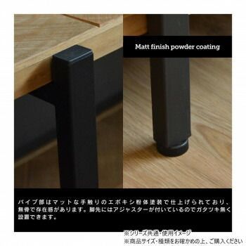カレイドシリーズは三角形にカットした古材風のパイン材をジオメトリックに並べた、質感の高い天板・棚板に、無骨でシンプルなアイアンパイプを組み合わせたシリーズです。