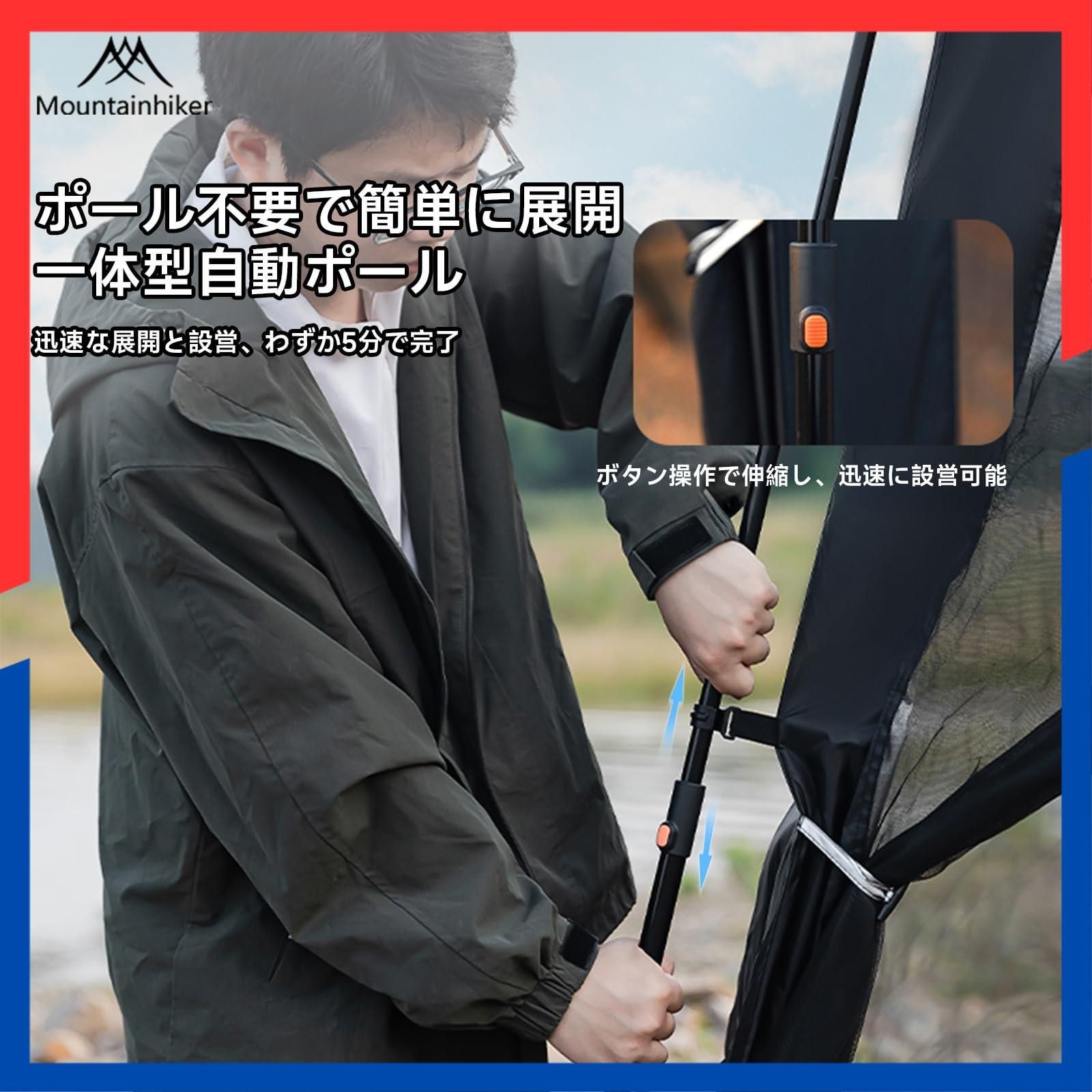 【ワンタッチ自動展開・簡単設営】フレームは自動開閉式で、引っ張って持ち上げるだけで数秒で設営完了。複雑な組立は不要、初心者や女性一人でも安心です。