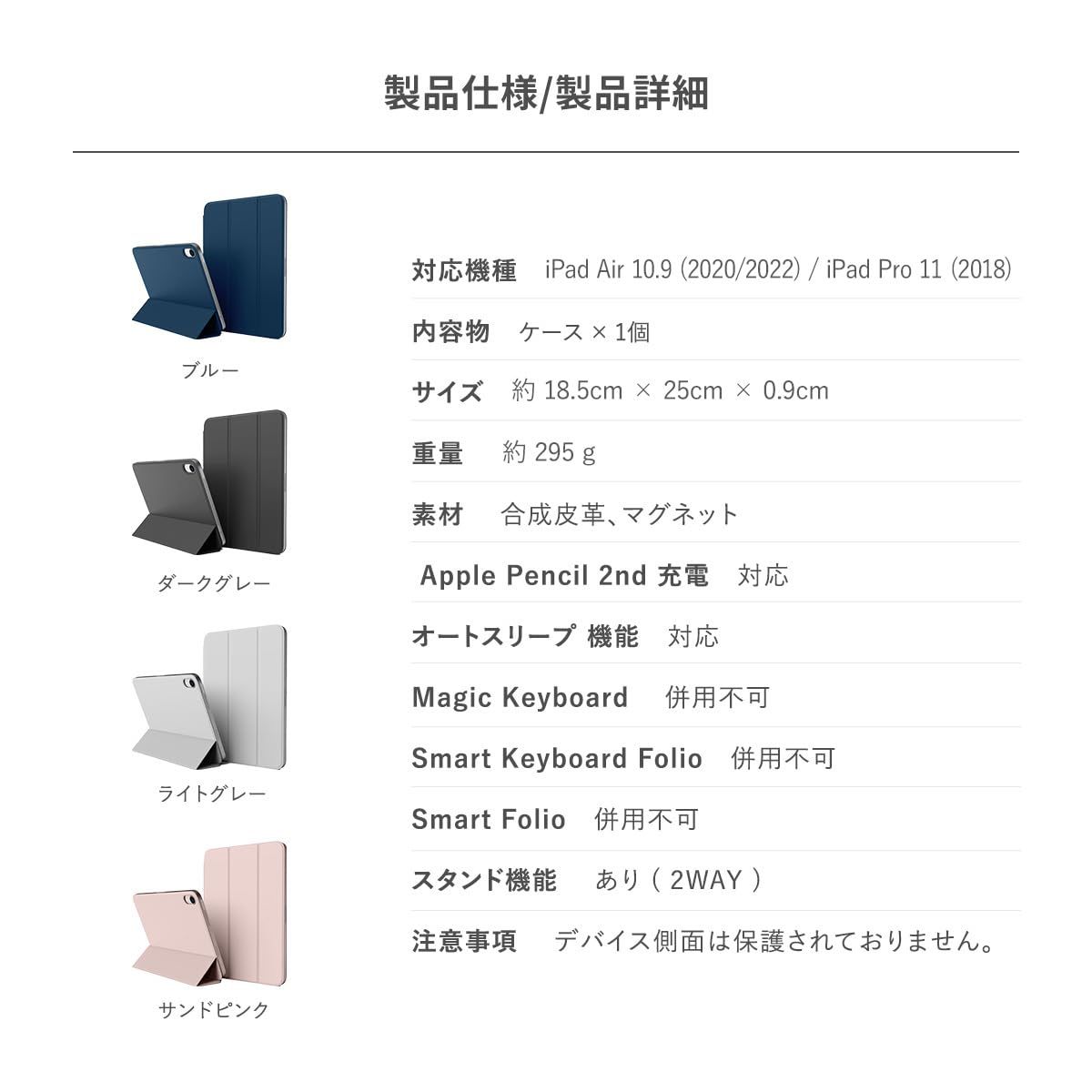 【製品特徴】… ◆ Apple Pencil 2nd 充電 : 対応 ◆ オートスリープ 機能 : 対応 ◆ Magic Keyboard : 併用不可 ◆ Smart Keyboard Folio : 併用不可 ◆ Smart Folio : 併用不可 ◆ スタンド機能 : あり ( 2WAY ) ◆ 注意事項 : デバイス側面は保護されておりません。