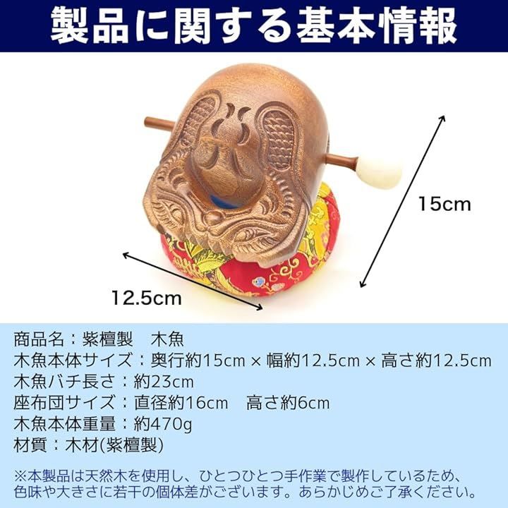 Aoiro Marin 自宅で法要する方に最適 木魚 木製 バチと座布団セット 紫檀製x高耐久 ブラウン 奥行15 cm x 幅12 5 高さ12