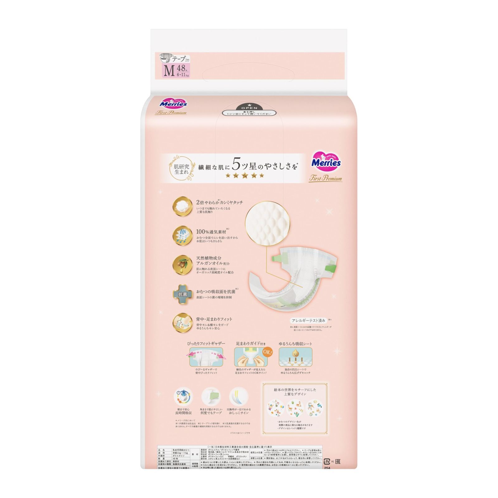 肌研究生まれ 繊細な肌に5ツ星のやさしさを* 2倍やわらか※1カシミヤタッチ いつまでも触れていたくなる上質な肌触り 100%通気素材※2 おむつ全面でムレを追い出すからお肌はいつもさらさら ゆるうんち吸収 凹凸シート 独自の凹凸シートで肌あたりやわらかうんちも肌につきにくい 天然植物成分アルガンオイル配合 肌に触れる表面シートにオーガニック高純度オイル配合 表面シート上を抗菌※3 肌に触れる表面シート上で菌の増殖を抑制 アレルギーテスト済み※4 ※4 表面シートにおける試験・すべての方にアレルギーが起こらないというわけではありません。 絵本の世界をモチーフにした上質なデザイン ・おむつのデザイン・色が実際の商品と異なる場合があります ・デザインは1パック1種類です *メリーズ内において ※1 外装部分当社品比 ※2 テープフック部を除く ※3 肌表面を抗菌するものではありません。すべての細菌の増殖を抑制するものではありません。 横モレ&背中モレを防ぐフィットギャザー 朝まで安心長時間吸収 角まるで肌にやさしい何度でもテープ 交換時が一目でわかるおしっこサイン