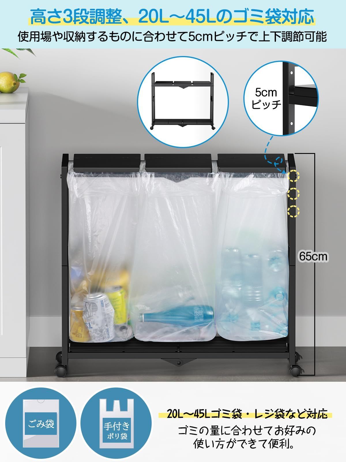 【3連ゴミ袋ホルダー仕様】 サイズキャスター付き:約W70×D32.5×H65cm/アジャスター付き:約W70×D32.5×H61.5cm 各蓋:W20.5×D32.5cm ◎重量:約6.4KG ◎材質:スチール(紛体塗装)対応ゴミ袋:20L~45L。1台で同時に3つのゴミ袋を設置でき、空き缶やびん、ペットボトル、プラスチックなどゴミを分別するのに便利です。