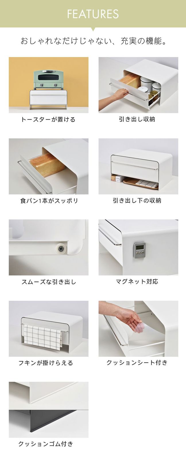 キッチン周りをスッキリ収納できる「UtaU ブレッドドロワー」。本体上面にはトースターを置けるので、省スペースで効率的に使えます。引き出しはローラー付きでスムーズに開閉でき、奥の物も取りやすい設計。フェルトクッションにより静かに閉まる仕様です。下部スペースにはラップやレシピ本などを収納でき、ステンレス取っ手にはフキン掛けも可能。本体はマグネット対応でタイマーやフックの取り付けも便利。清潔感のあるデザインで、キッチンを快適に演出します。