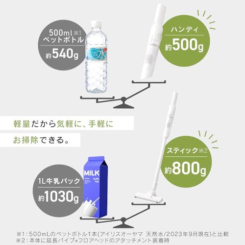 製品サイズ(cm):[本体のみ(ハンディ時)]幅約6奥行約6高さ約42[延長パイプ、フロアヘッド含む(スティック時)]幅約24奥行約14高さ約93[スタンド収納時]幅約16奥行約21高さ約52 / 質量:[本体のみ(ハンディ時)]約0.5kg[延長パイプ、フロアヘッド含む(スティック時)]約0.8kg[スタンド収納時]約1.3kg
