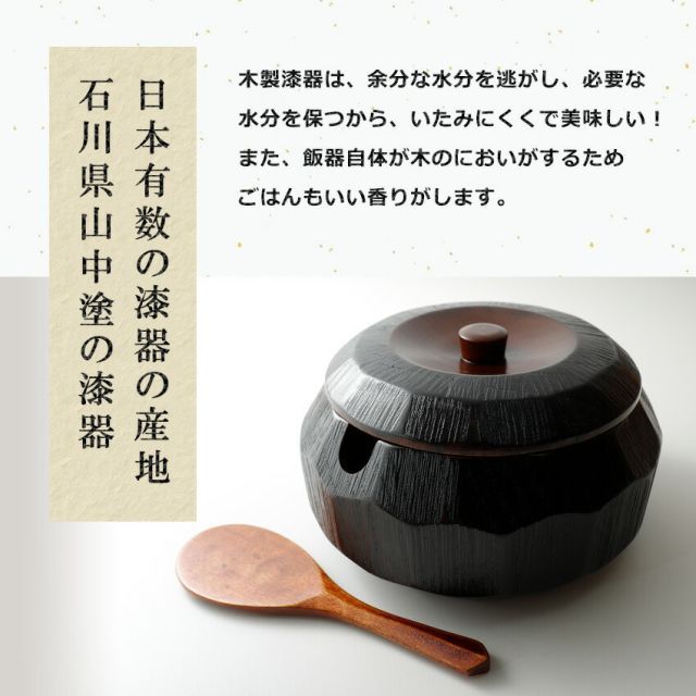 木製漆器は、余分な水分を逃がし、必要な水分を保つから、いたみにくくで美味しい!また、めしびつ自体が木のにおいがするため、ごはんもいい香りがします。最新の電化製品では味わえない、木製漆器ならではあたたかさとぬくもりを感じてください。