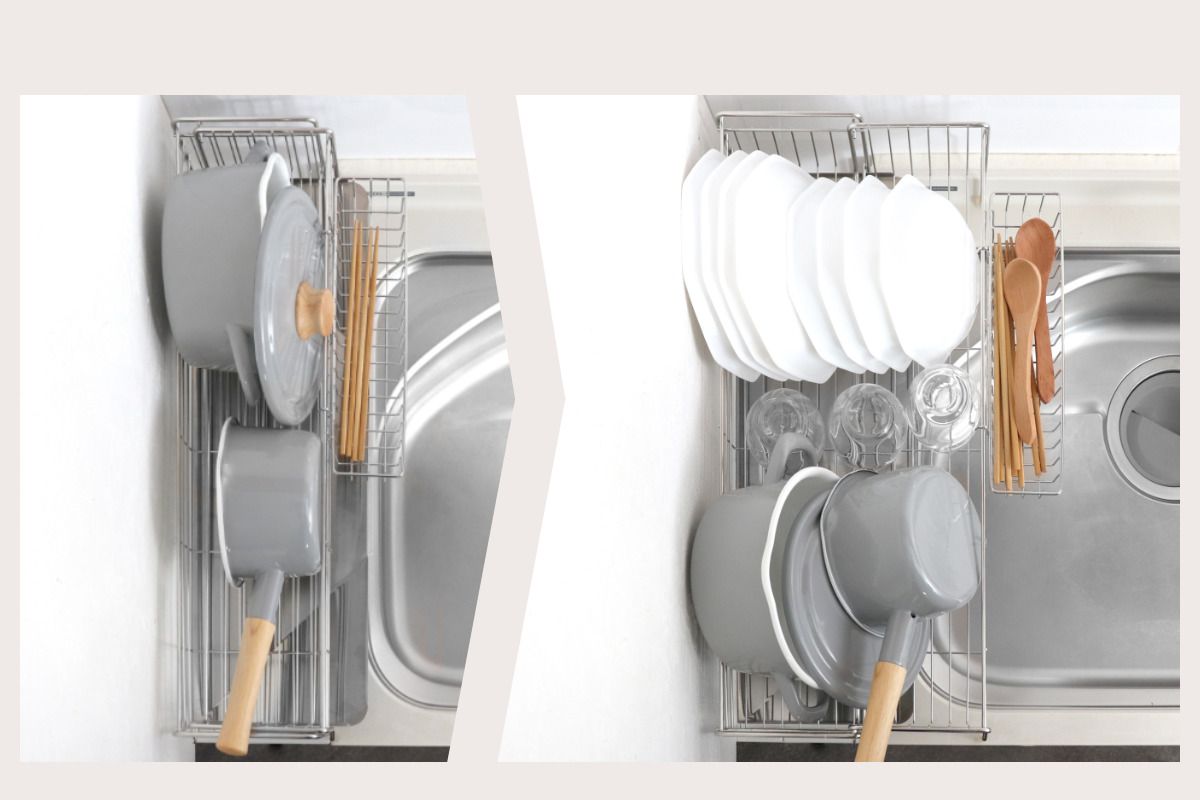 ●洗い物の量に合わせて幅を伸縮できる水切りラックです。
