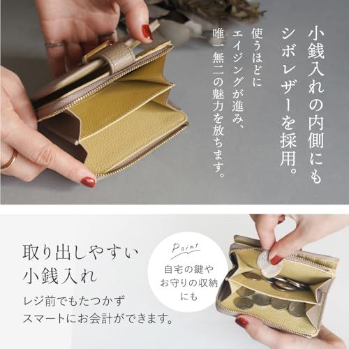 【ずっと触れていたい 美しいシボレザー。 】しっとりなめらかな手触りの 牛本革を贅沢に使いました。 丈夫で傷が目立ちにくいので 永く愛用いただけます。【小銭入れの内側にも シボレザーを採用。】使うほどにエイジングが進み、唯一無二の魅力を放ちます。
