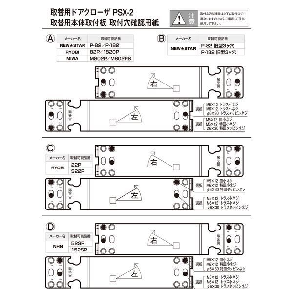 ドアクローザはメーカーや機種によって取付ネジ位置が異なります。PSX-2は取付板に複数の取付穴が空いており、様々なネジ位置に対応出来るようになっております。シャープなデザインでコンパクト設計。取付ネジが露出しないので外観がスッキリします。閉扉速度調整は3バルブ方式。ドアを確実に閉鎖するラッチング機能付。ストップ角度は70°〜180°の任意の角度に設定可能。左右兼用タイプ。本体を上下転倒し、閉扉速度調整バルブを吊元側に向けて使用して下さい。取付穴隠しシールで取付穴を隠せます。