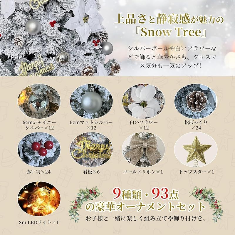 ????【迫真のスノーツリー& 圧倒的な存在感を放つ】 2025年待望のクリスマスツリーの雪ヴァージョン、上品さと静寂感が魅力の『Snow Tree』が新登場!雪の積もったツリーを見たとき、子供たちはきっとワクワクし、優しさやときめき、自然の神秘を感じてくれます。シルバーボールや白いフラワーなどで飾ると華やかさも、クリスマス気分も一気にアップ! 本物の松ぼっくり、赤い実、リボンなど9種類・合計93点の豪華オーナメントが付属しているから、届いたその日からすぐにお子様と一緒に楽しく組み立てや飾り付けができます。