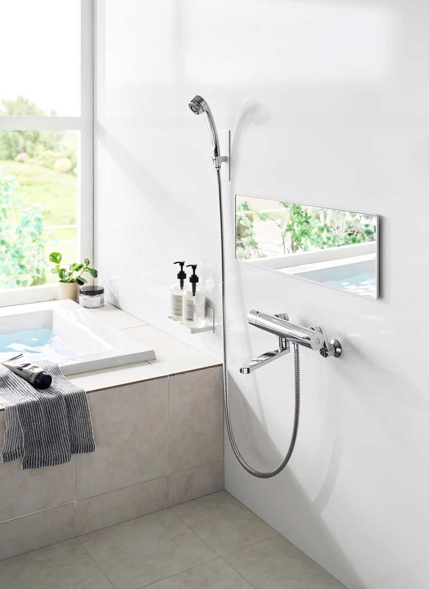 美しく、透明感があるロングサイズの角型ガラス製バスルームミラーです。フレームと壁の隙間に指を入れて取り外しやすい形状なので、お掃除がしやすく清潔に保てます。曇り止めフィルムを全面に粘着加工しているため、鏡面が曇らず快適にお使いいただけます。