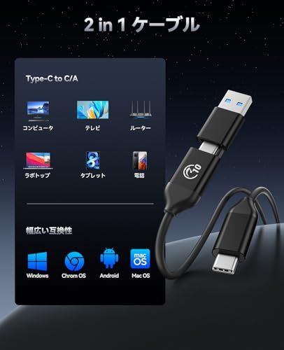 【2 in 1ケーブルで多デバイス対応】付属のUSB-C to C/A 2 in 1ケーブルにより、Windows/macOSパソコンはもちろん、Androidスマホ・iPad・ゲーム機など幅広い端末にプラグ&プレイ。面倒な設定なし即挿即用ですぐに使用可能。